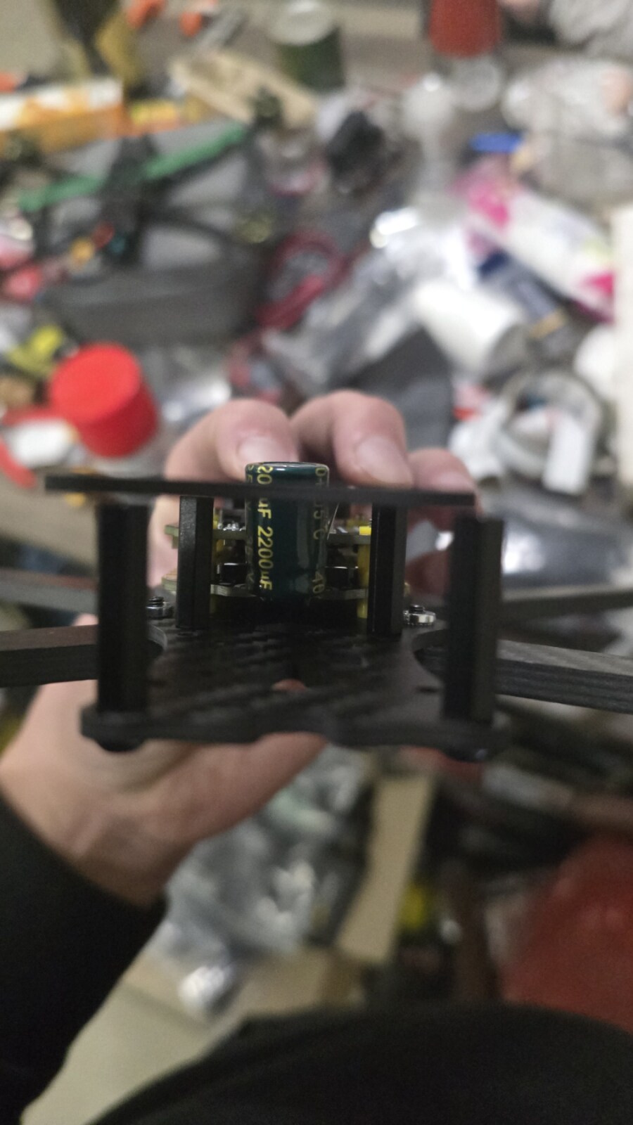 в 7v2 ну ніяк конденсатор не стає. Висота конденсатора 20мм як і висота рами, але ж ще є висота регулятора і впаятись без відступа неможливо. покласти конденсатор в горизонталь теж нема можливості, бо нікуди ставити vtx. Якість проставок під камеру теж вимагає напильника