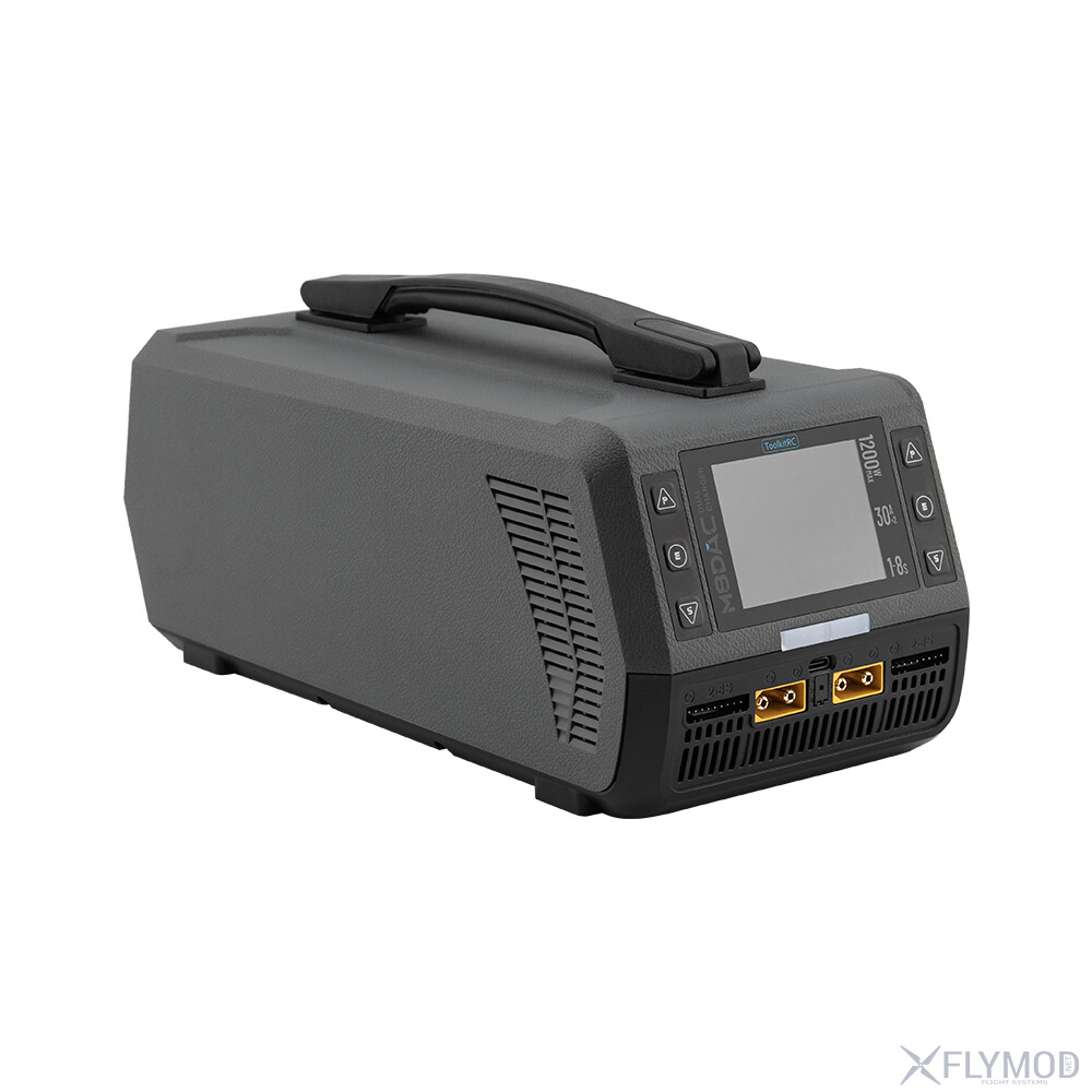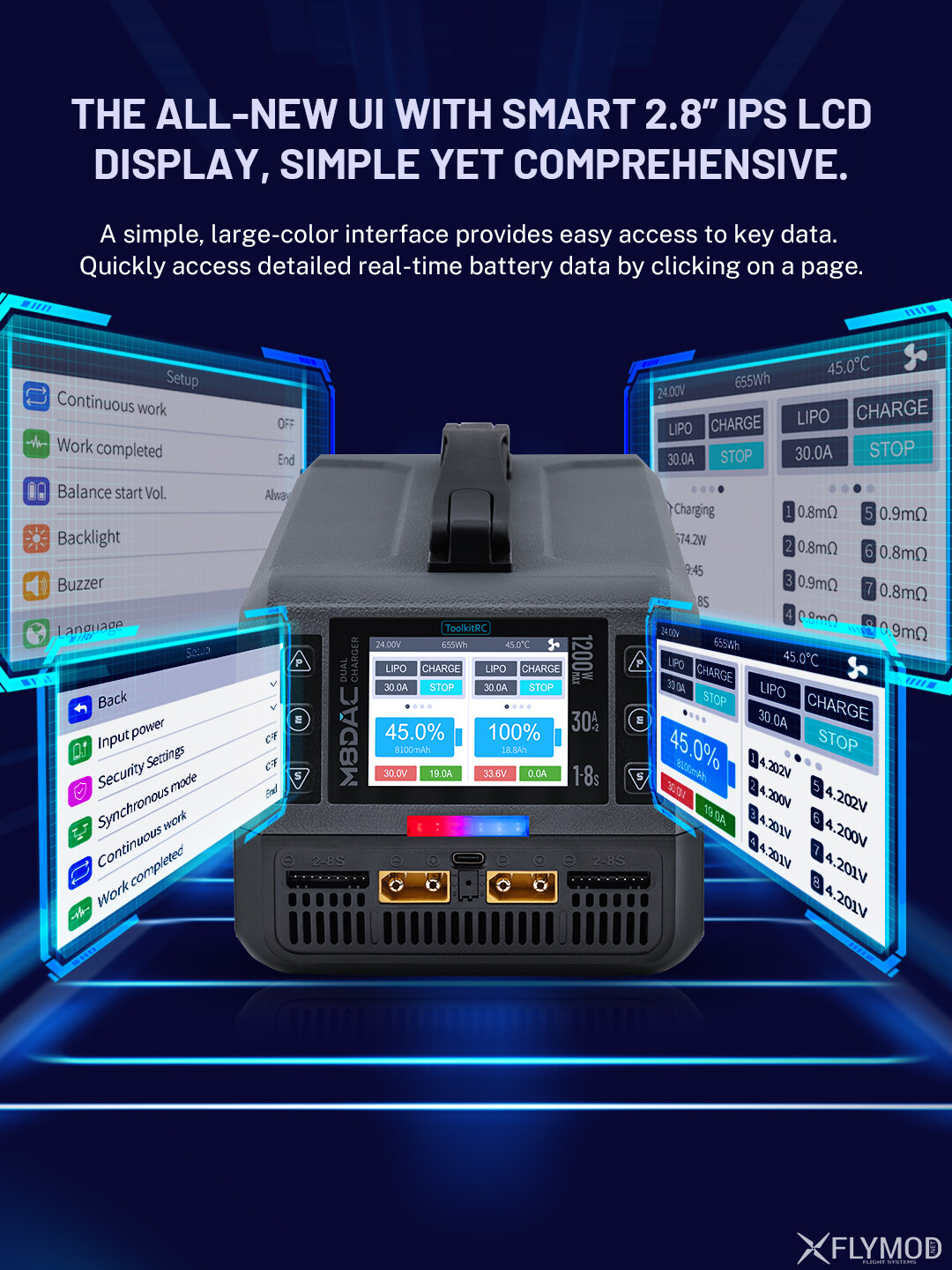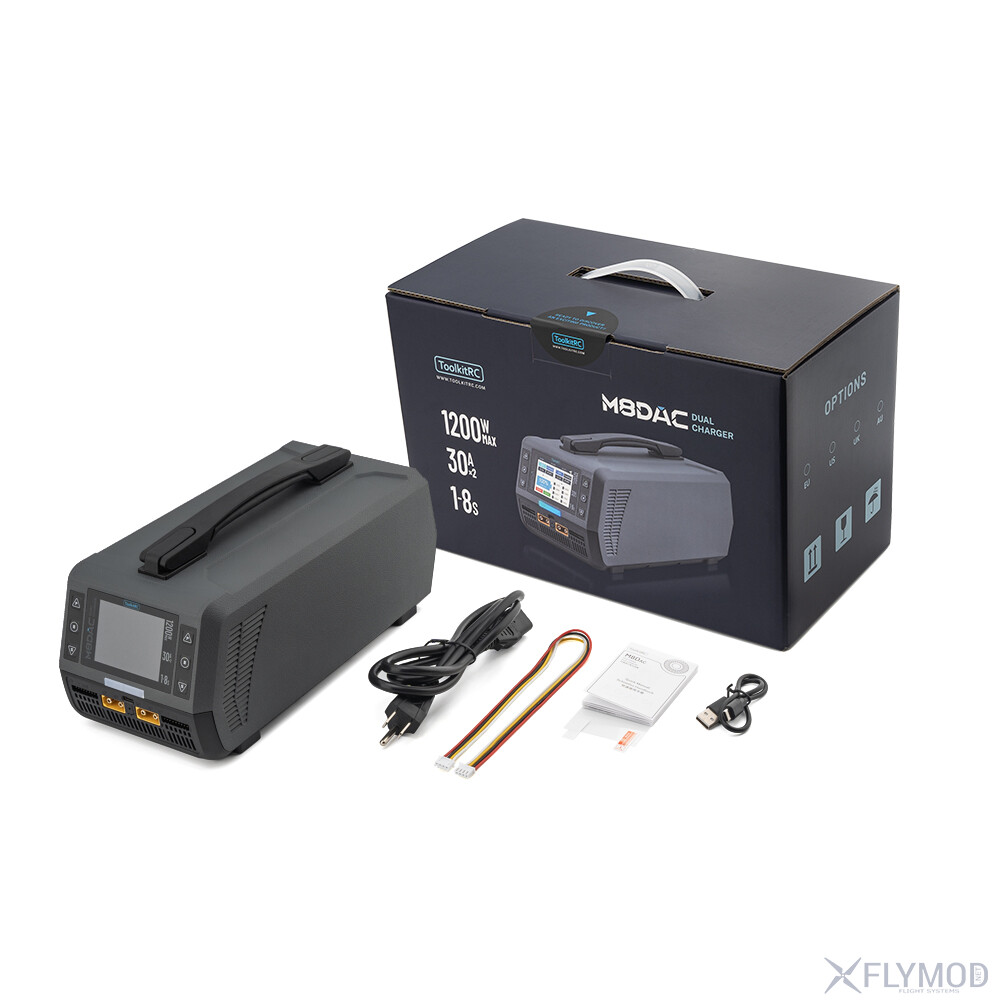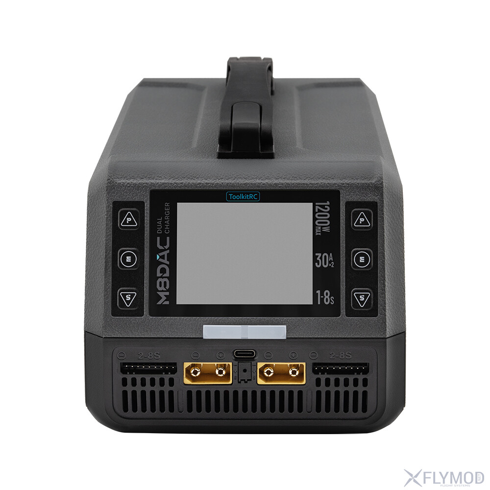 Toolkit M8DAC 1200W 1-8S charger is an easy-to-use and powerful dual-channel balancing charger designed for LiPo and LiHV batteries from 1S to 8S. It operates in two modes: asynchronous mode with up to 600W of power and up to 30.0A of current per channel, and synchronous mode, which reaches a maximum power of up to 1200W with up to 50.0A of current per channel, suitable for efficient charging of large batteries. Supports a wide range of AC 100-240V input voltage with a maximum output of 1300W. The 65W Type-C fast charging function allows you to charge other mobile devices such as phones, tablets, laptops, remote controls, etc. The 2.8-inch IPS LCD screen displays all the necessary information with support for 11 languages, and a dynamic LED bar shows the charging status in real time. The device has a convenient carrying handle.