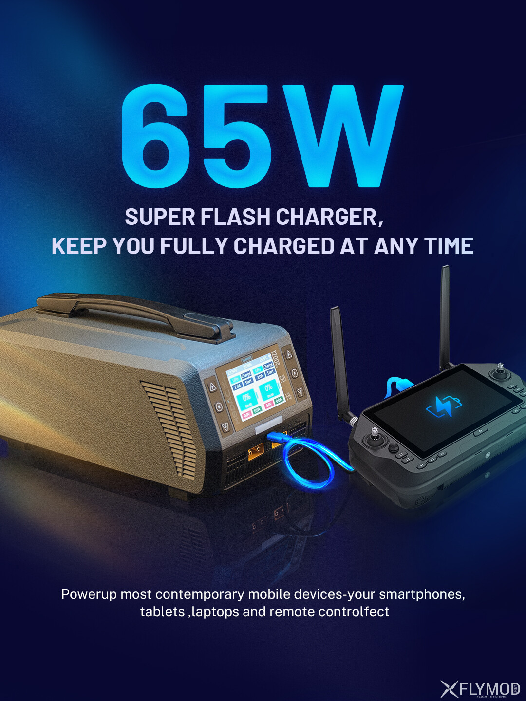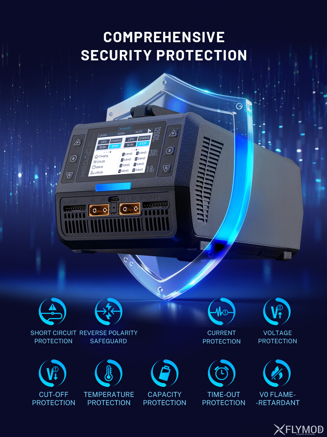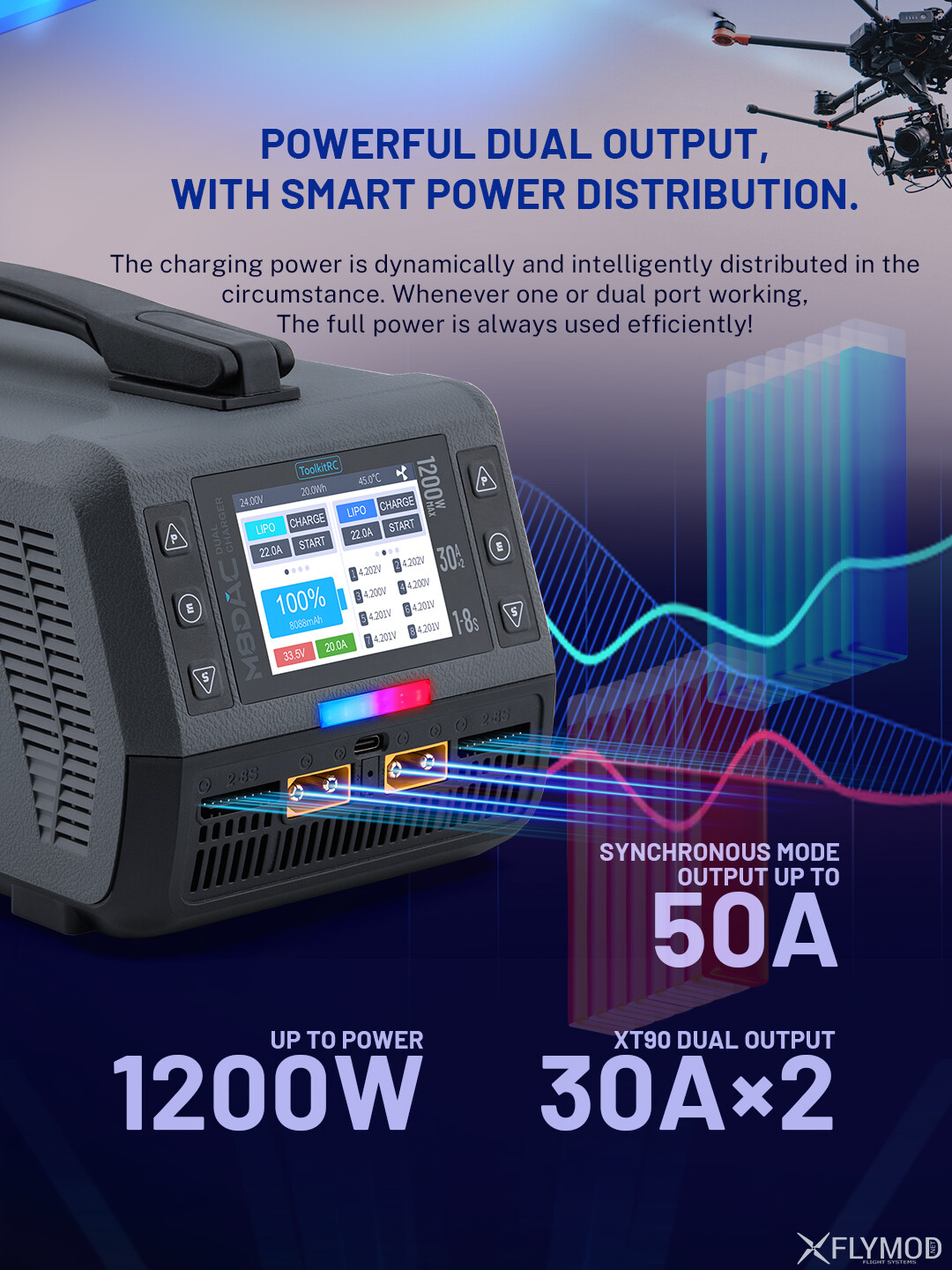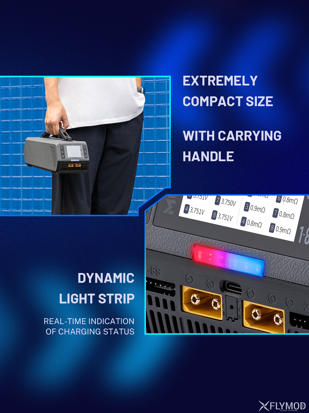Toolkit M8DAC 1200W 1-8S charger is an easy-to-use and powerful dual-channel balancing charger designed for LiPo and LiHV batteries from 1S to 8S. It operates in two modes: asynchronous mode with up to 600W of power and up to 30.0A of current per channel, and synchronous mode, which reaches a maximum power of up to 1200W with up to 50.0A of current per channel, suitable for efficient charging of large batteries. Supports a wide range of AC 100-240V input voltage with a maximum output of 1300W. The 65W Type-C fast charging function allows you to charge other mobile devices such as phones, tablets, laptops, remote controls, etc. The 2.8-inch IPS LCD screen displays all the necessary information with support for 11 languages, and a dynamic LED bar shows the charging status in real time. The device has a convenient carrying handle.