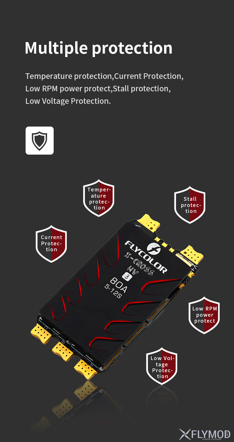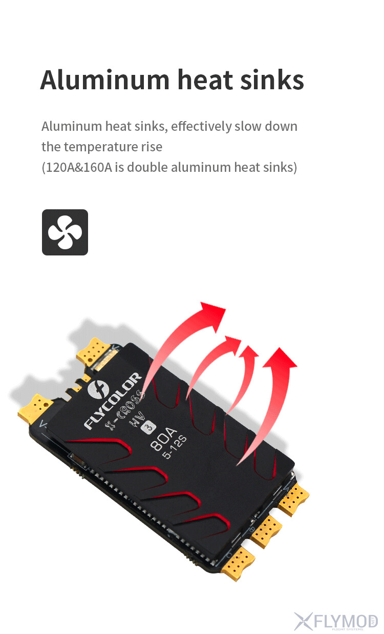 Регулятор швидкості FLYCOLOR X-Cross HV3 ESC 120A/160A призначений для точного керування безколекторними двигунами у моделях з високими навантаженнями. Працює від живлення 5-12S LiPo та має дві моделі з постійним струмом 120А та 160А. Підтримуються протоколи Dshot, Proshot, Oneshot і Multshot, що гарантує сумісність з більшістю систем керування. Оснащений 32-бітним мікроконтролером ARM Cortex, забезпечує стабільну роботу при великих струмах. Подвійні алюмінієві радіатори підвищують ефективність охолодження та запобігають перегріву.