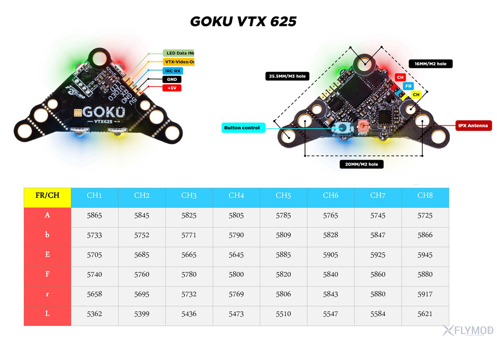 ДетальнішеВідео передавач FLYWOO GOKU VTX625 для мікро- та міні- квадрокоптерів з отворами для монтажу на польотний стек. Має високу вихідну потужність передавання сигналу 450mW і вбудоване світлодіодне підсвічування.