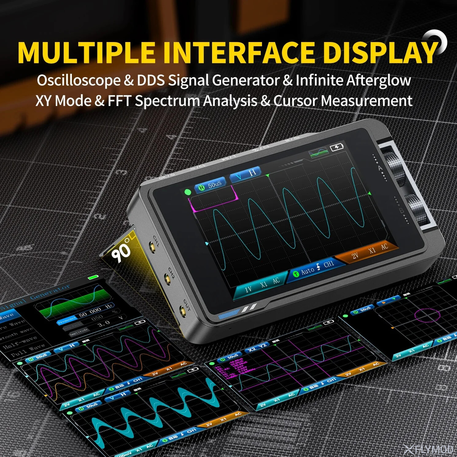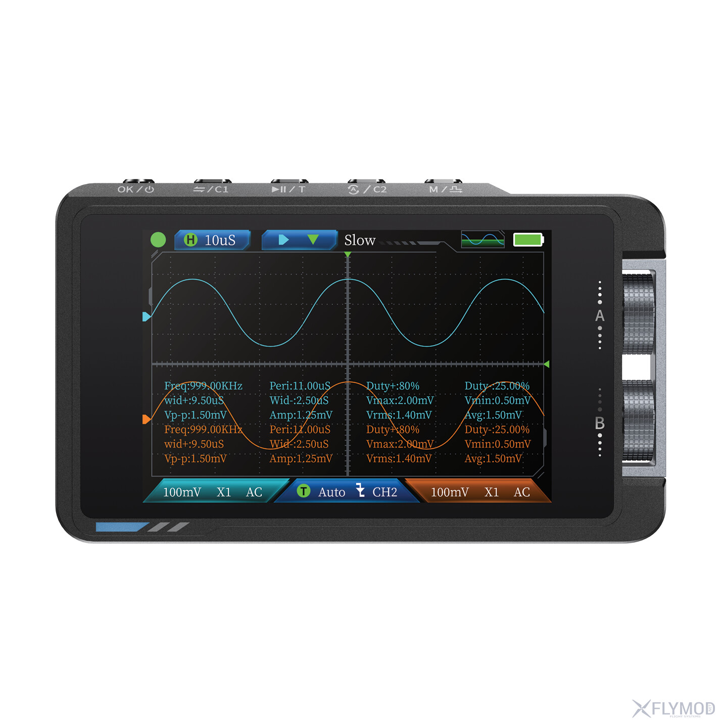Цифровий осцилограф із вбудованим генератором сигналів FNIRSI DS215H 2-в-1 поєднує двоканальний осцилограф та генератор сигналів в одному портативному та ефективному пристрої. Побудований на архітектурі FPGA+MCU+ADC він забезпечує високу точність вимірів із частотою дискретизації до 250MSa/s та смугою пропускання 50MHz. Повна відповідність стандартам захисту та підтримка пікової вхідної напруги до ±400V гарантує надійну роботу в умовах високої напруги. Генератор сигналів підтримує 13 форм вихідного сигналу в діапазоні частот 0-50KHz і дозволяє повністю регулювати вихідні параметри, такі як частота, амплітуда та коефіцієнт заповнення відповідно до потреб користувачів. Живлення здійснюється від акумулятора ємністю 1500mAh, який надає до 4 годин безперервної роботи та може заряджатися через USB-C (5V/1A). 3.5-дюймовий екран з роздільною здатністю 480×320 відображає інформацію в чіткому та зрозумілому вигляді з підтримкою 8 мов, а вбудована функція збереження та перегляду знімків екрана спрощує та розширює можливості аналізу даних. Компактна конструкція робить можливим використання цього пристрою за будь-яких обставин.