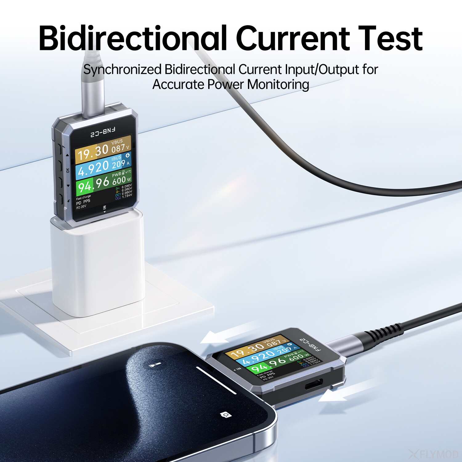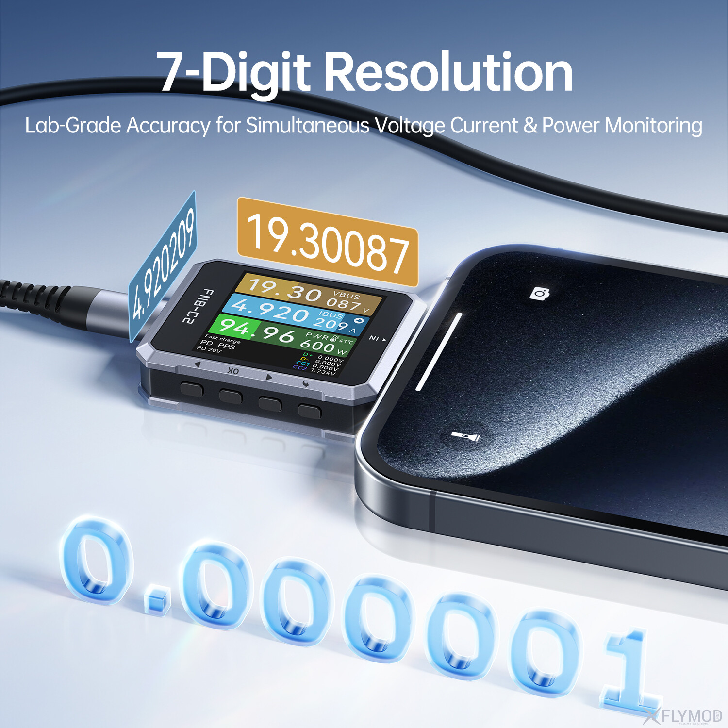 Тестер FNIRSI FNB-C2 USB Type-C PD 3.1 дозволяє надійно та ефективно вимірювати різні параметри живлення для діагностики зарядних пристроїв та кабелів. 20-бітний АЦП (ADC) гарантує високоточне вимірювання напруги, струму та потужності з роздільною здатністю 0.000001V/A/W. Може відстежувати напругу в діапазоні 4-50V, струм 0-6.5A і потужність 0-240W, підтримуючи сценарії заряджання за високої потужності 100W/140W/240W.