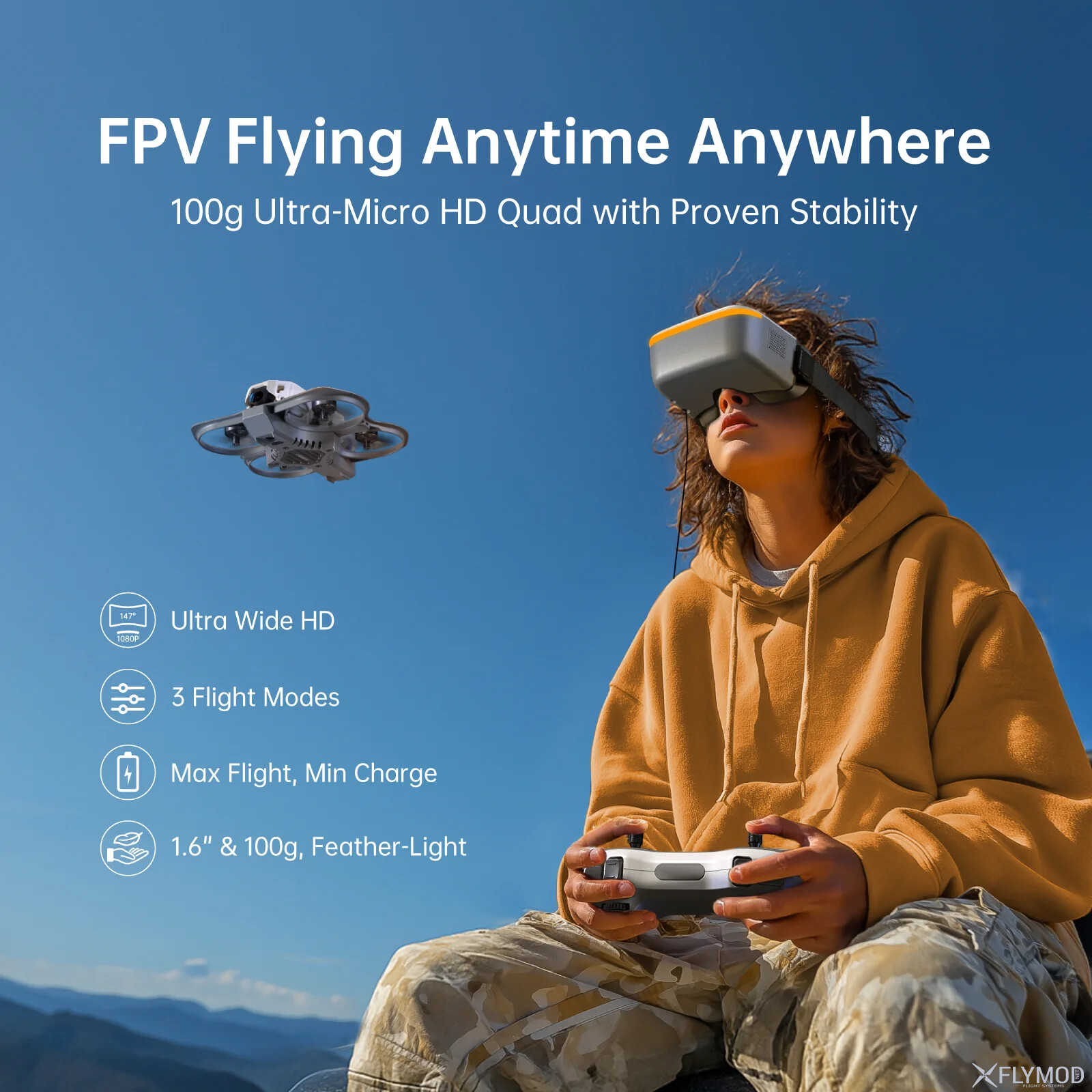 Окуляри Ascent Goggles з 4.5" дисплеєм високої роздільної здатності видають чітке і плавне зображення з низькою затримкою 35мс. Підтримка SD-карт до 256G дозволяє записувати відео в реальному часі. Вбудовані антени з посиленням 4.9dBi тримають стабільний сигнал без перешкод в діапазоні частот 5.8GHz. Пульт керування Alink оснащений ELRS 2.4GHz RF-модулем відрізняється швидкістю відгуку, дальністю дії та силою проникнення сигналу. Він сумісний з більшістю симуляторів FPV, що допомагає практикуватися в керуванні.