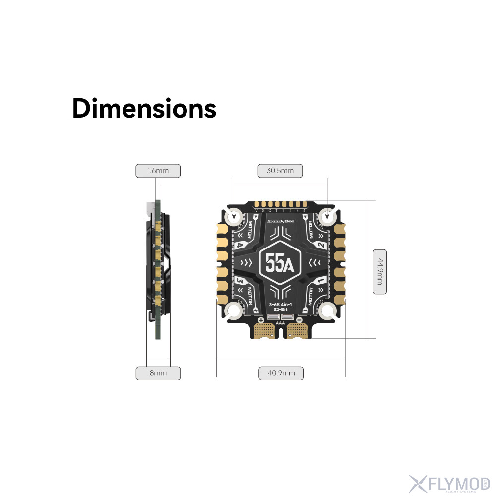 Регулятор швидкості SpeedyBee OX32 55A 30x30 4в1 витримує постійний струм 55А на кожен канал, що дозволяє стабільно працювати навіть при високих навантаженнях. Розрахований на акумулятори 3–6S і підходить для різних типів живлення. У регуляторі передбачена телеметрія та датчик струму, завдяки чому можна контролювати робочі параметри під час польоту. Прошивка OX32 разом із підтримкою DSHOT300/600 забезпечує точне й швидке керування. У комплекті входить конденсатор на 1000uF, який захищає систему від стрибків напруги. При вазі 19г та стандартному кріпленні 30.5*30.5мм легко інтегрується в більшість рам.