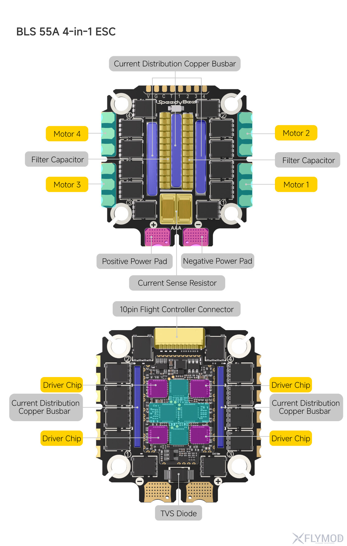 Регулятор швидкості OX32 55A здатний витримувати постійний струм до 55А на канал з піковими навантаженнями до 70А, що підходить для потужних FPV-дронів