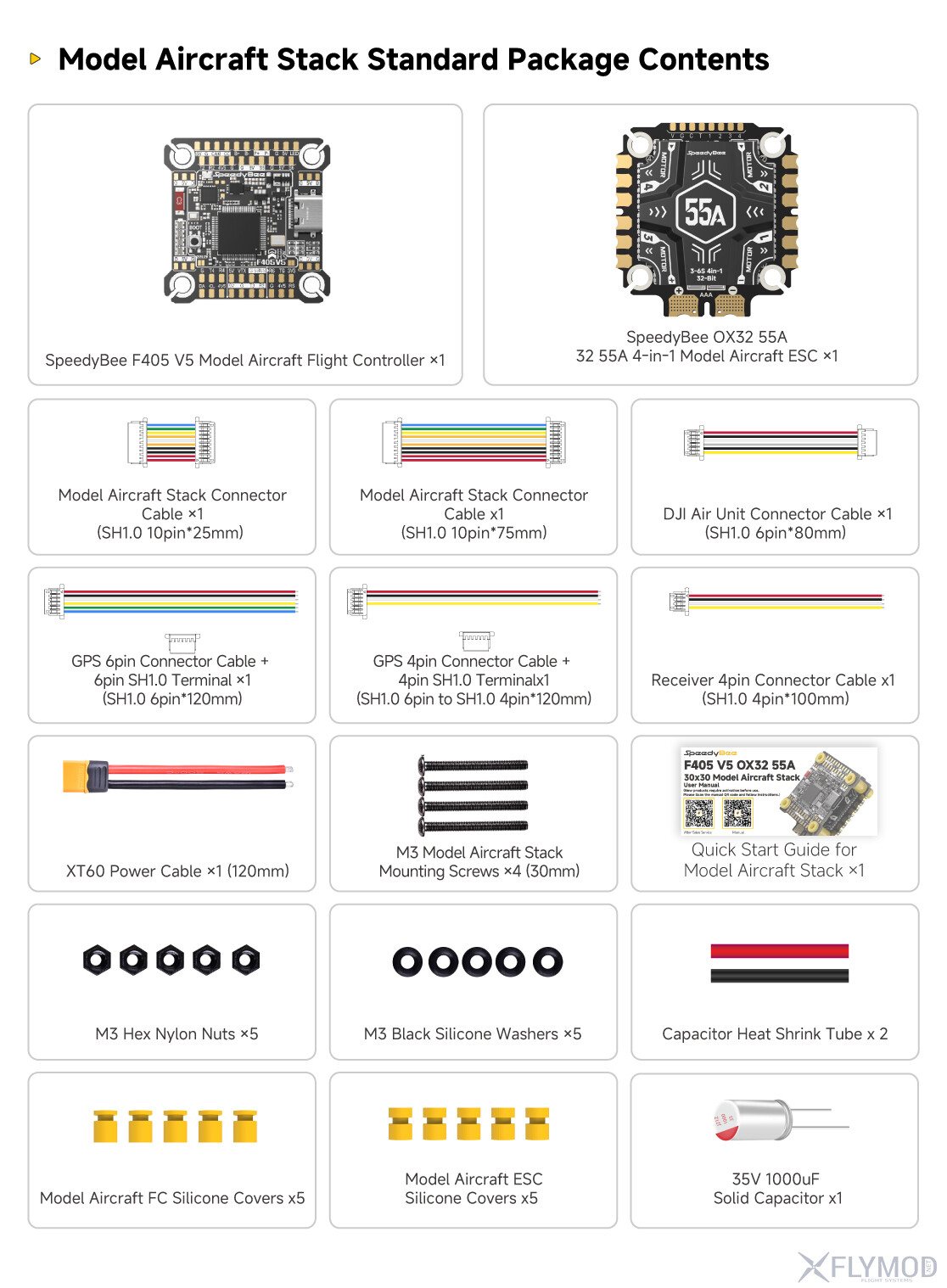 Стек SpeedyBee F405 V5 OX32 55A поєднує в собі сучасний контролер польоту FC та надійний регулятор швидкості ESC. ESC здатний витримувати 55А на канал із запасом пікового струму до 70А. Контролер побудований на процесорі STM32F405 з гіроскопом ICM42688P, що дозволяє отримати точну стабілізацію й швидку реакцію в польоті. Для налаштувань передбачено Bluetooth та запис логів у пам’ять Blackbox об’ємом 16МБ. Захист у вигляді TVS-діода та конденсатора 1000uF знижує ризики від стрибків напруги, підвищуючи стабільність системи під час польоту.